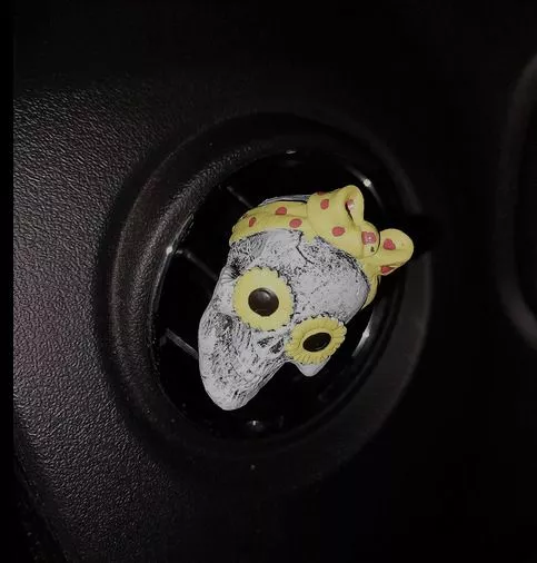 This little passenger is the best! I'm using one at a time for variety and because it amuses me. I initially thought the scent disc was neutral and designed for essential oils, but it's already scented, and it's quite pleasant. The vent clips are well-made, securely slide into the backs of the skeletons, and are easy to remove, swap out, or attach to a different vent. However, one of the clips broke while I was installing it, but the skeletons themselves feel sturdy, and the scent tabs have a mild and pleasant scent. I'll see how long it lasts and how strong it is. They're so cute; I love them!