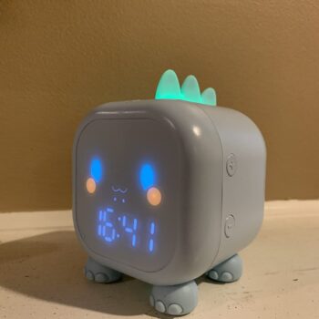 This dinosaur clock is adorable. My kids love it. Easy to set up, lights up in different colors, making a perfect night light. No issues after months of use. Highly recommend!